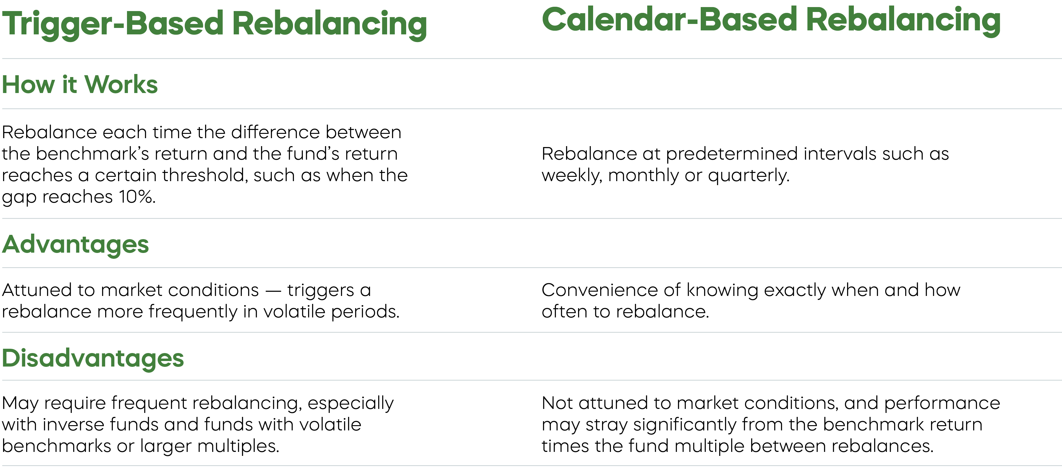 Rebalancing involves periodically adding to or trimming an investment in a fund to reduce the difference between the benchmark’s return and the fund’s return over time—sometimes called the "gap"—to help keep exposure in line with the fund’s stated objective. Rebalancing can buffer the negative effects of compounding during volatile periods, but it can also reduce the positive effects of compounding during trending periods. In addition, because rebalancing involves buying and selling shares, it may require additional cash and can result in transaction costs and tax consequences.