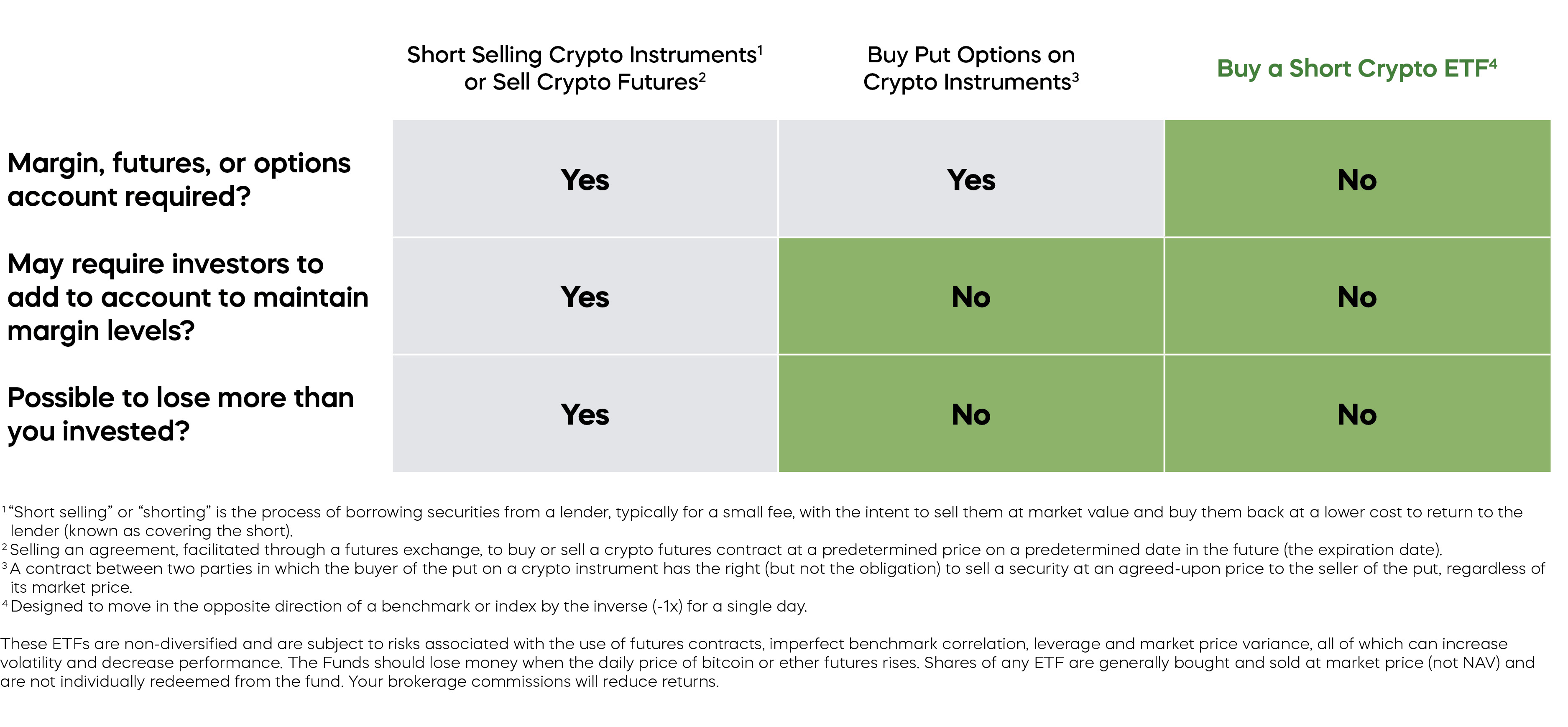 These ETFs are non-diversified and are subject to risks associated with the use of futures contracts, imperfect benchmark correlation, leverage and market price variance, all of which can increase volatility and decrease performance. The Funds should lose money when the daily price of bitcoin or ether futures rises. Shares of any ETF are generally bought and sold at market price (not NAV) and are not individually redeemed from the fund. Your brokerage commissions will reduce returns.